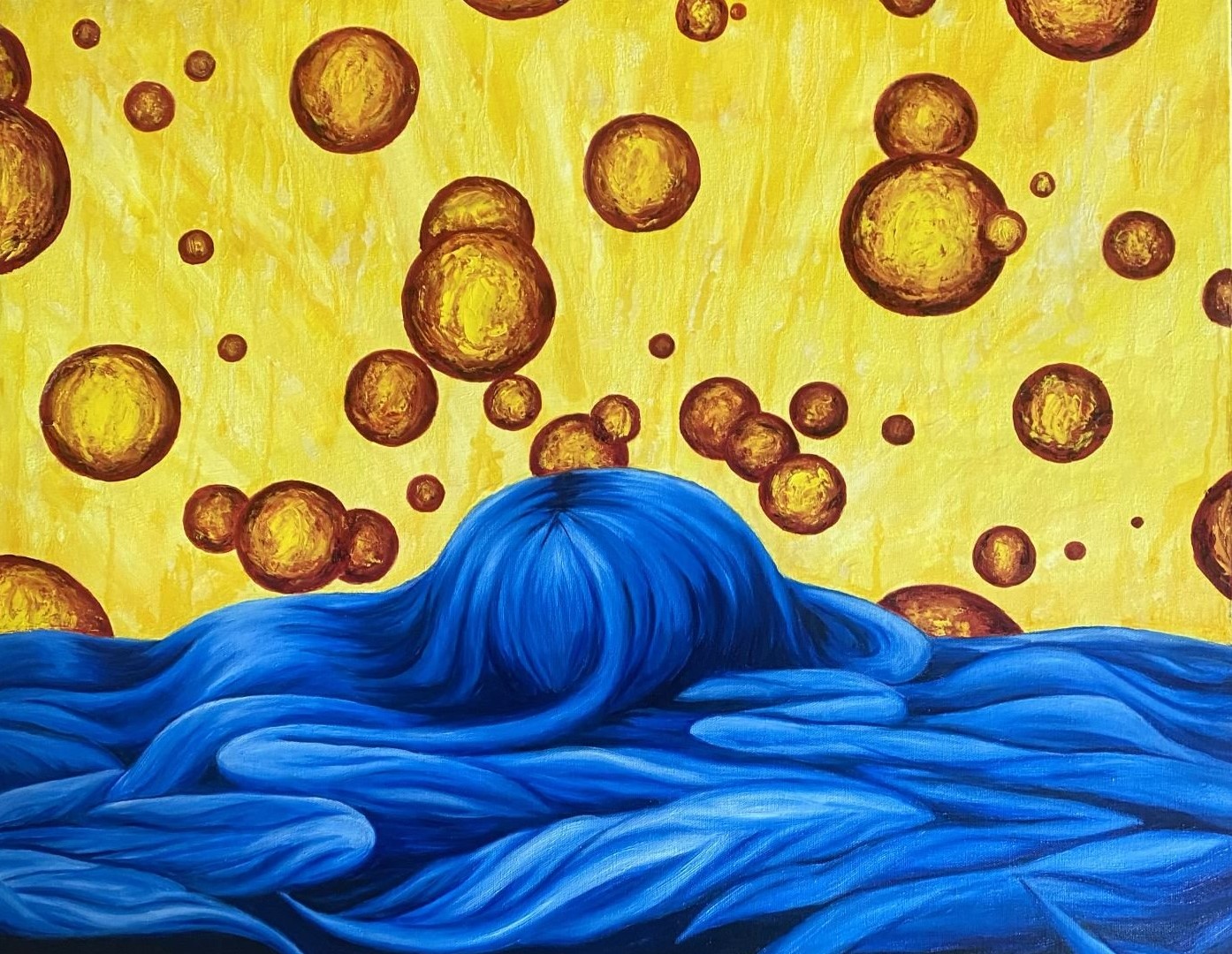 Oil on canvas, 24×30. How often in life do we allow ourselves to thoroughly enjoy our experiences? To be absolutely present in the moment? This Blue Hair Girl is seen completely overpowered with happiness and excitement.